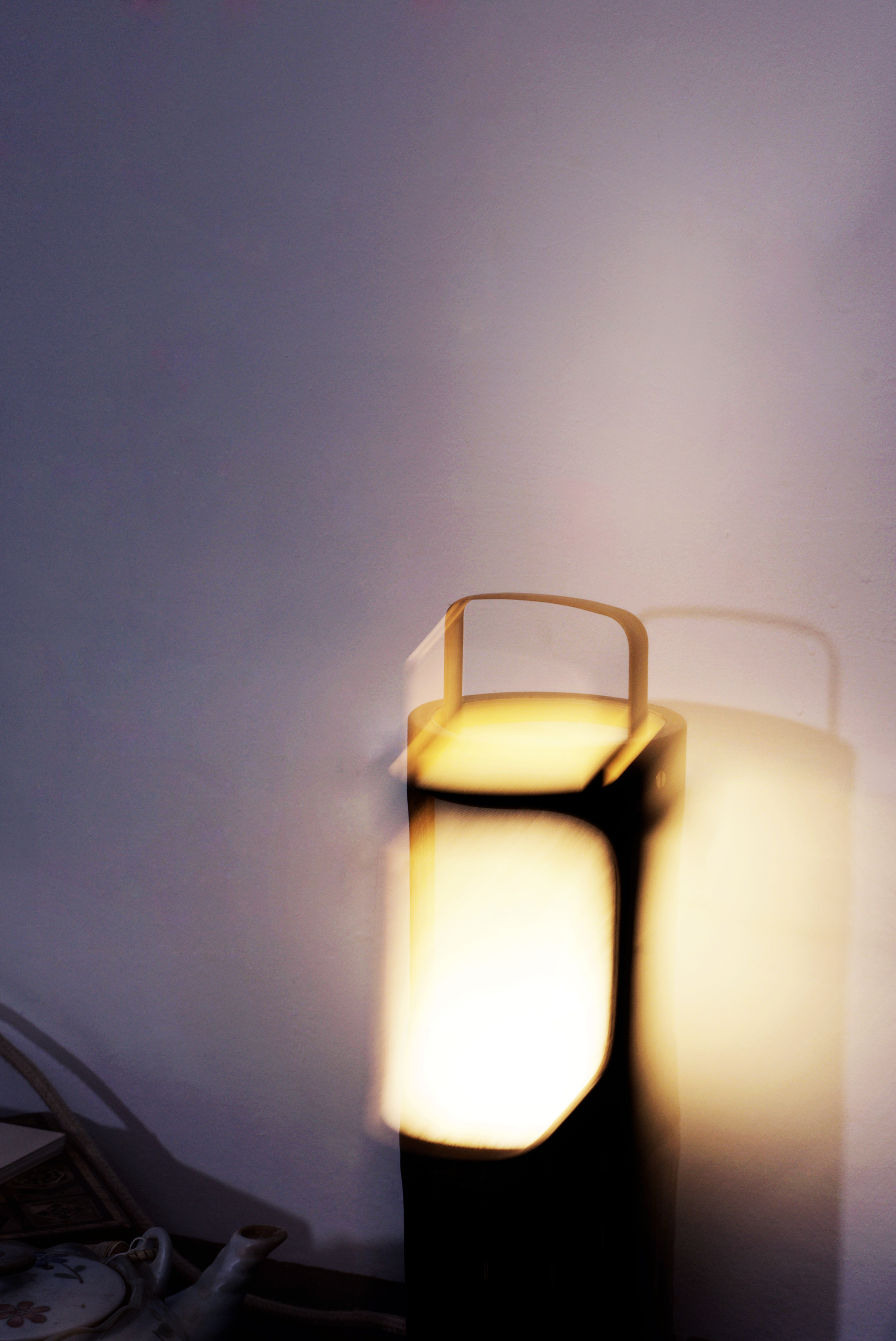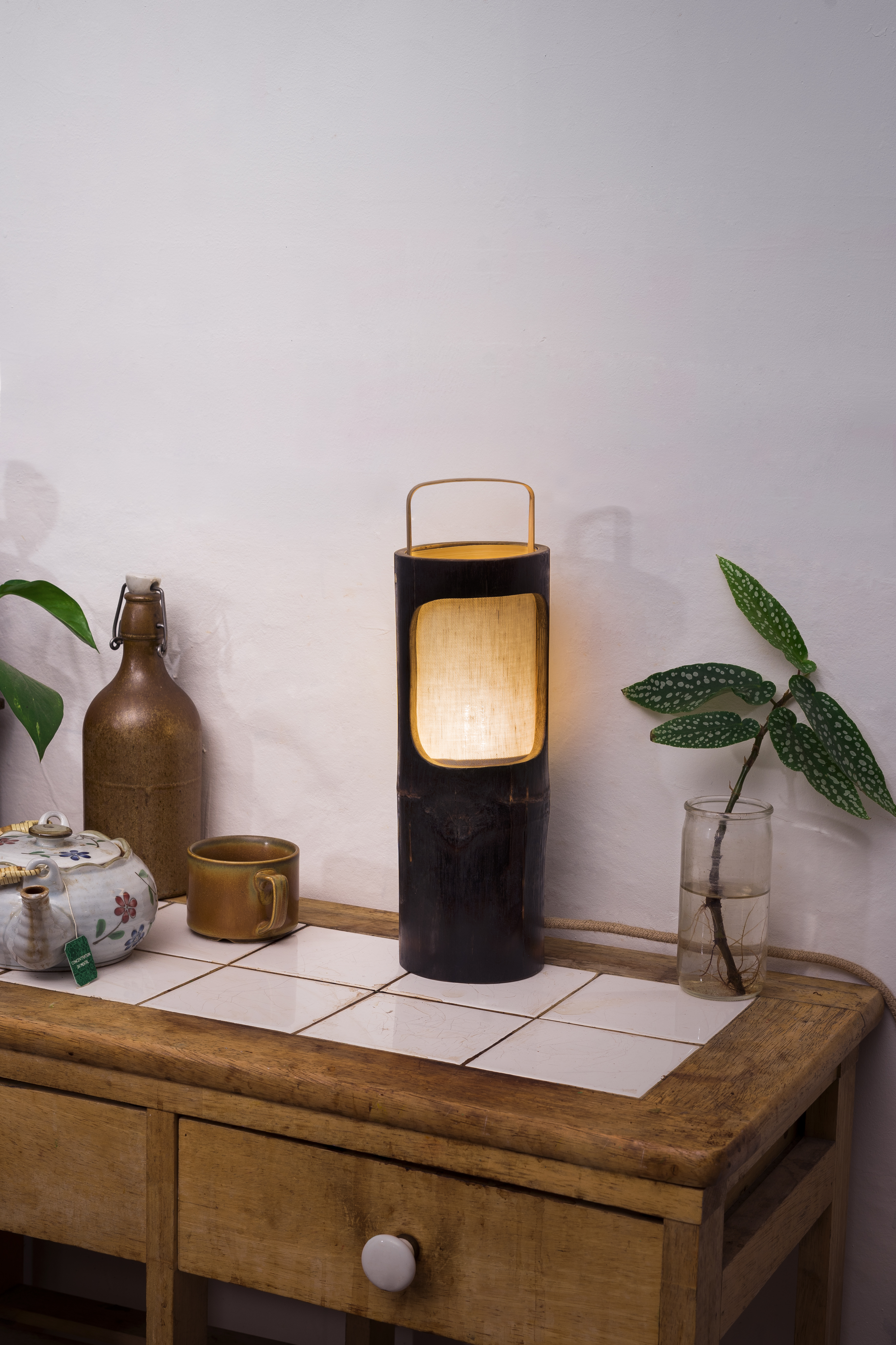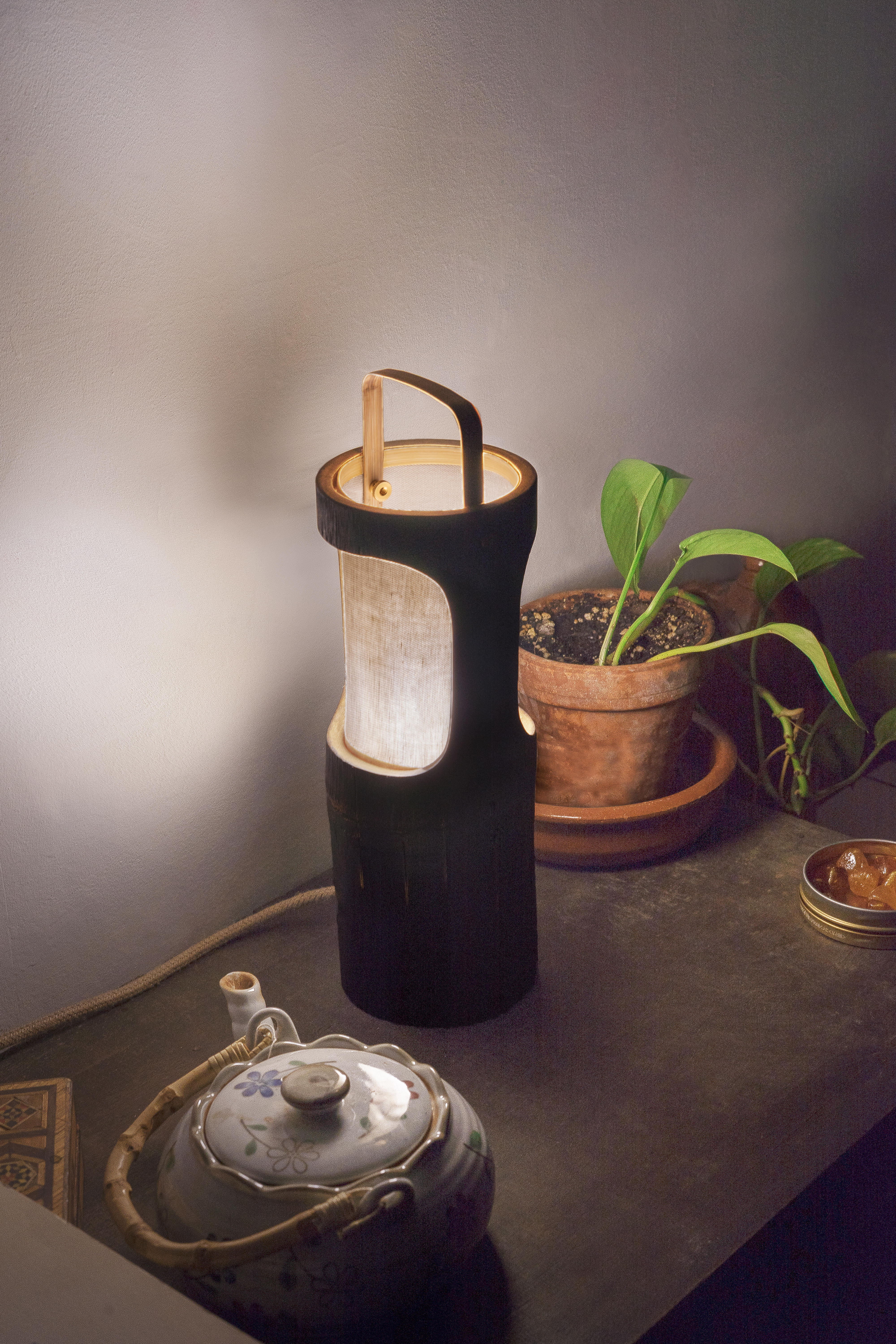 Matériaux : Bambou brûlé, coton et système d’éclairage