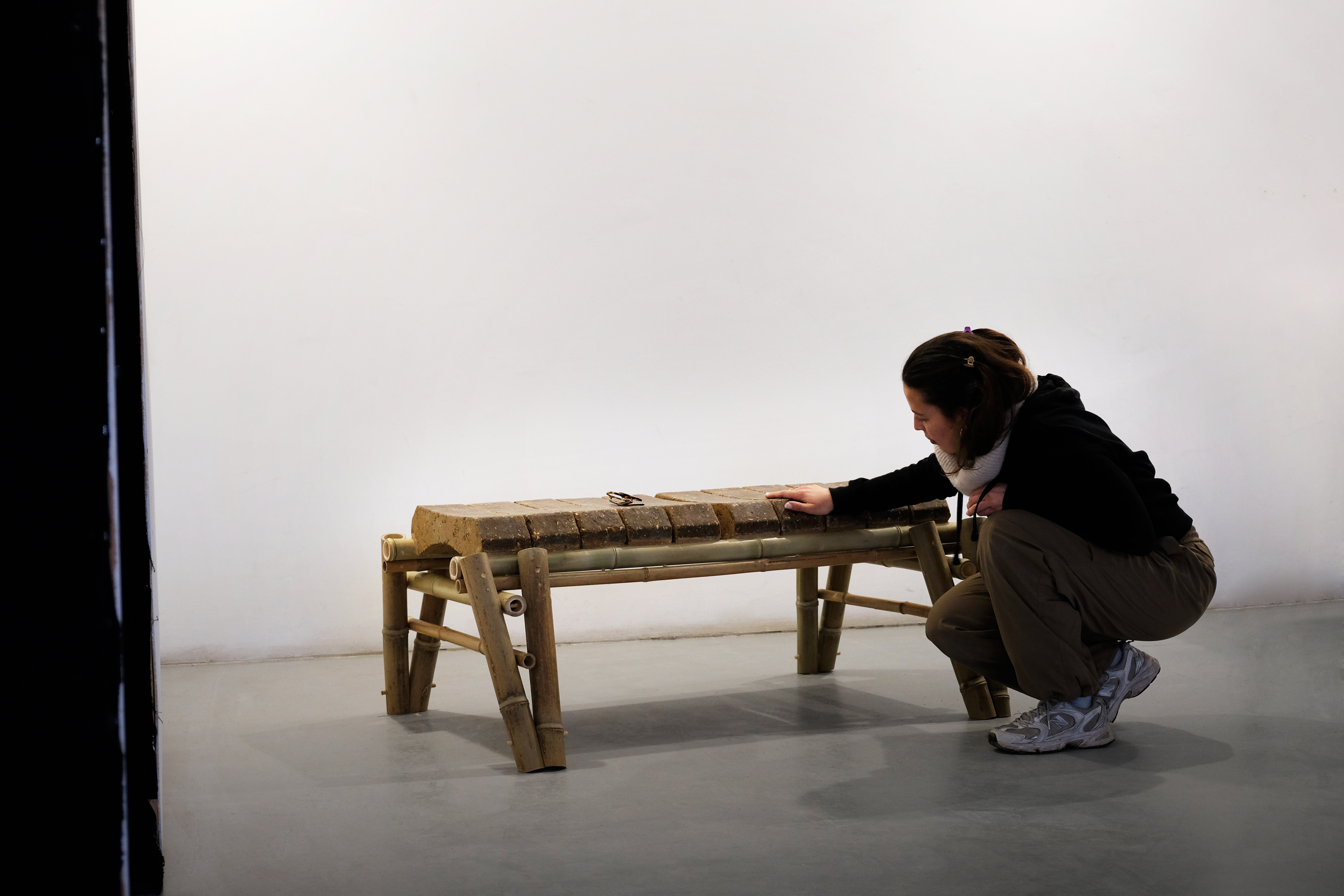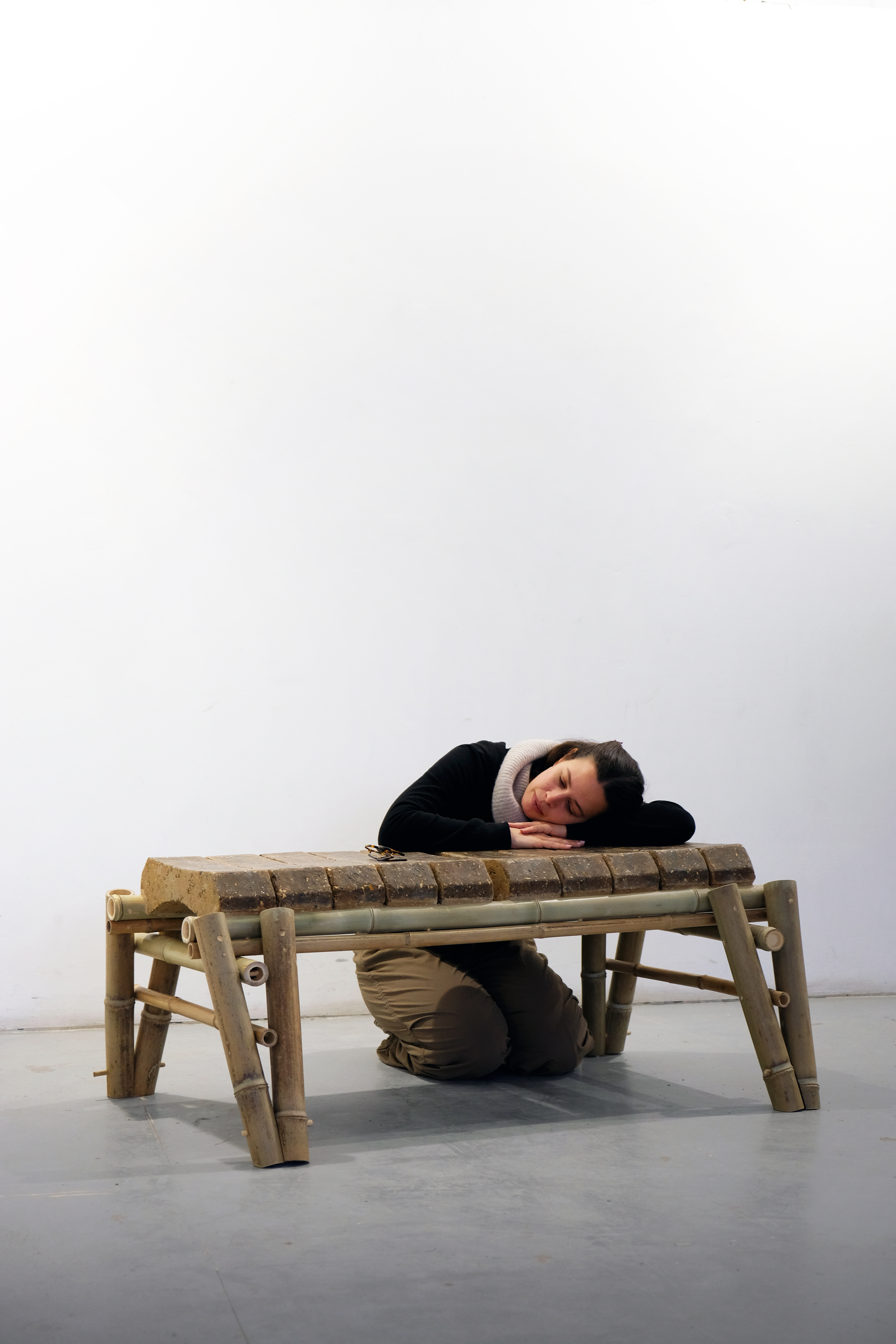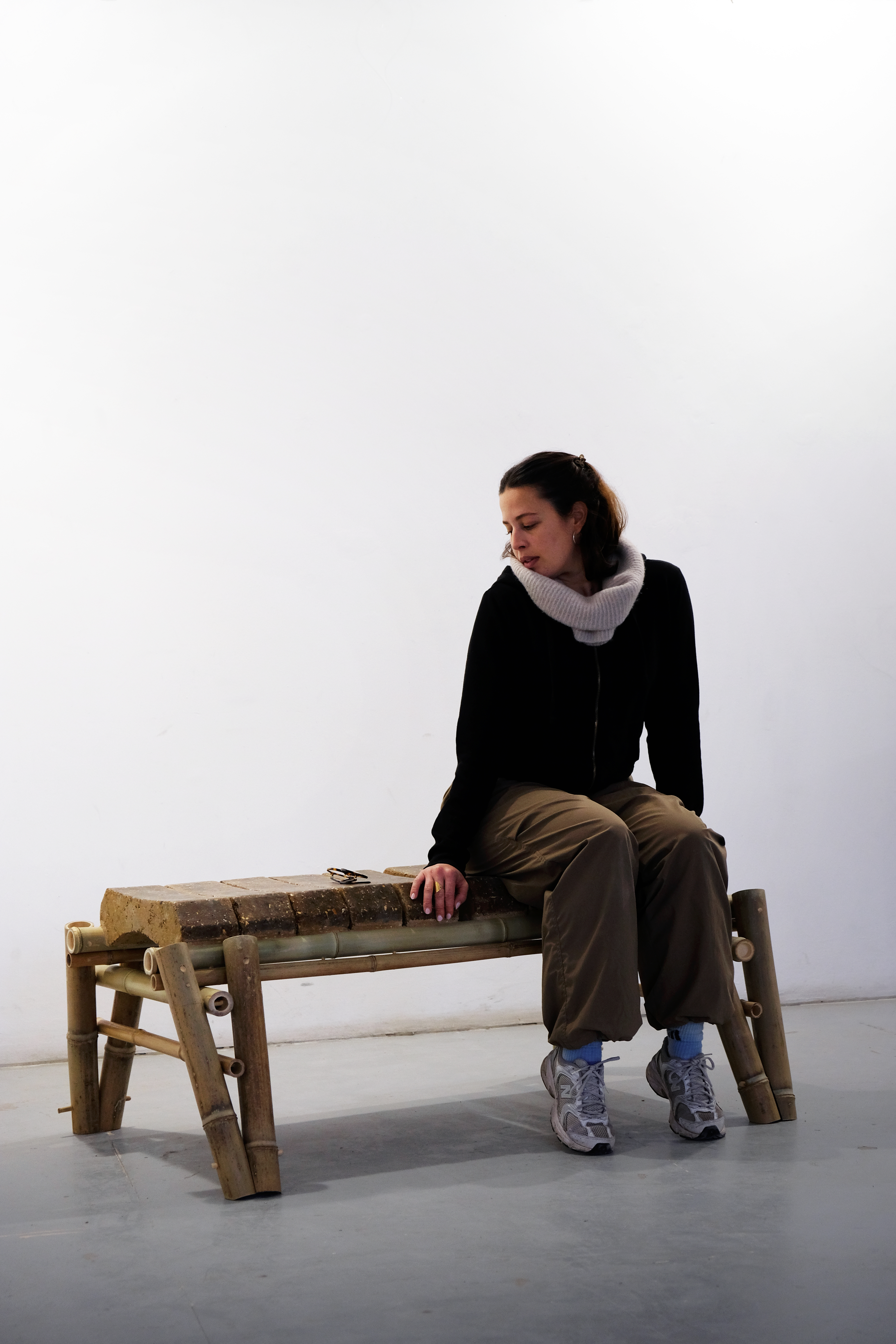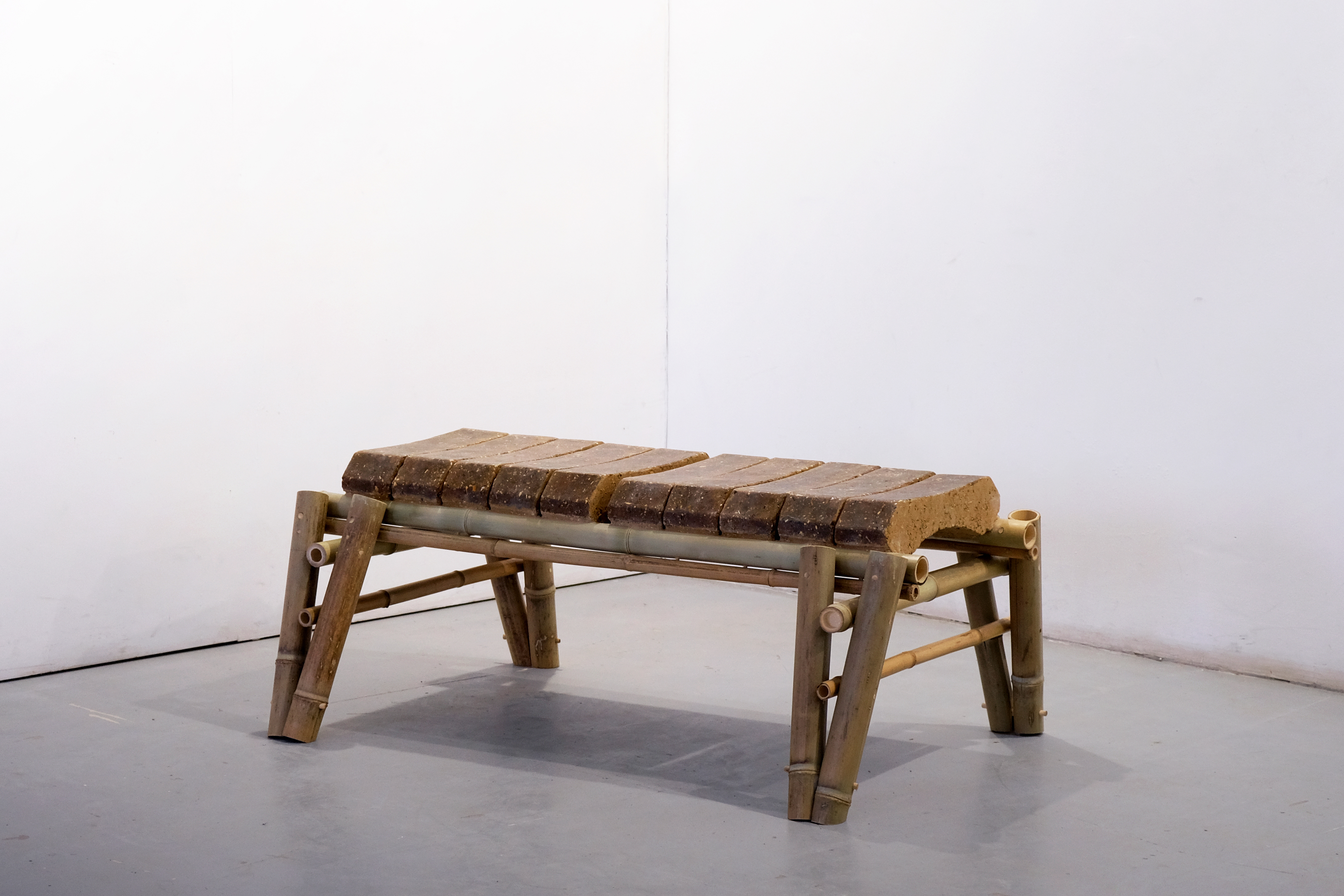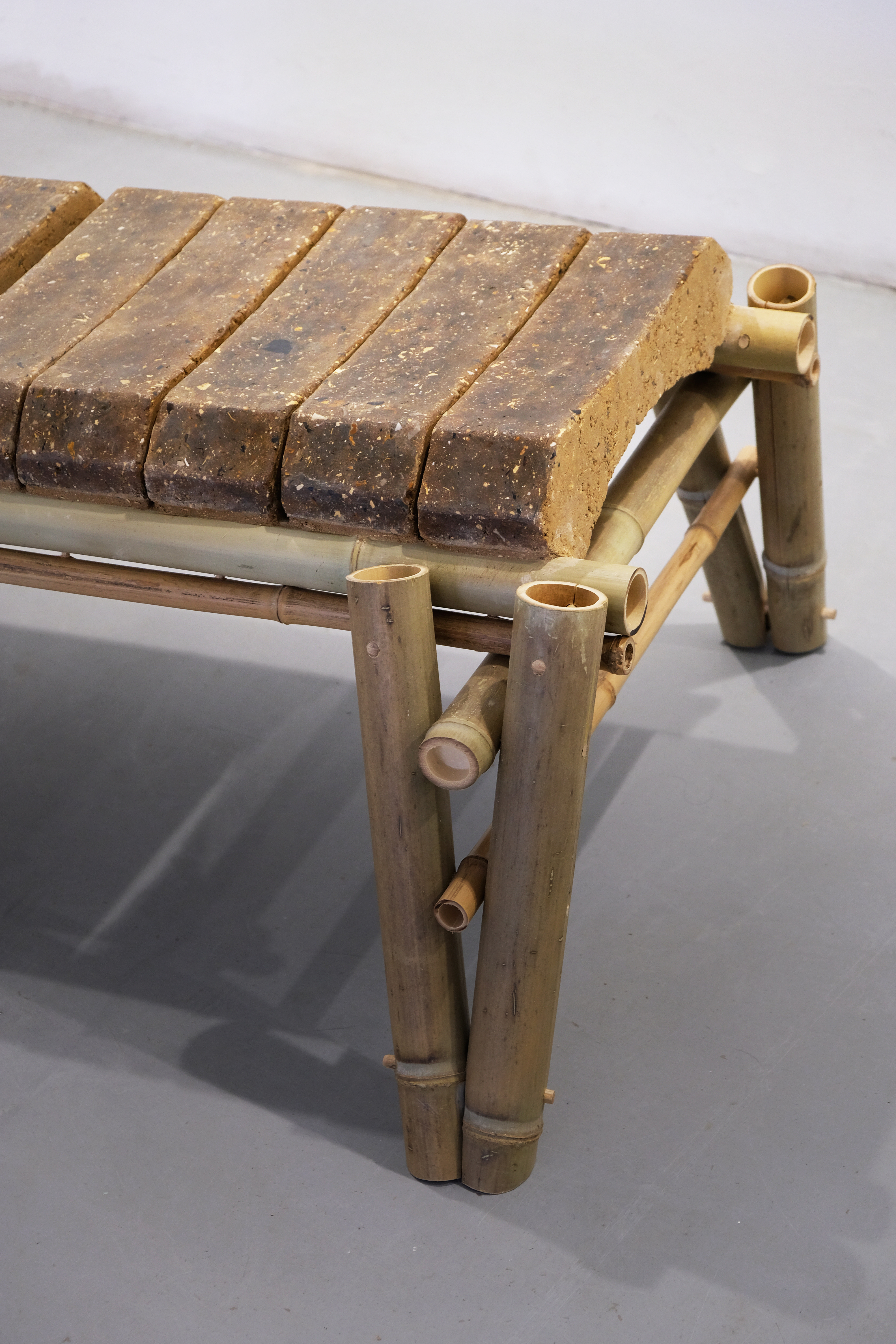Ce principe constructif, appelé “plancher à hourdis”, est ici appliqué à l’échelle du mobilier et fut l’occasion d’explorer une relation possible entre bambou et pisé. Ici la structure de l’assise est composée uniquement de chaume de bambou assemblé par tourillon et l’assise en elle-même réalisée en terre comprimée. Le processus donc est entièrement réversible.