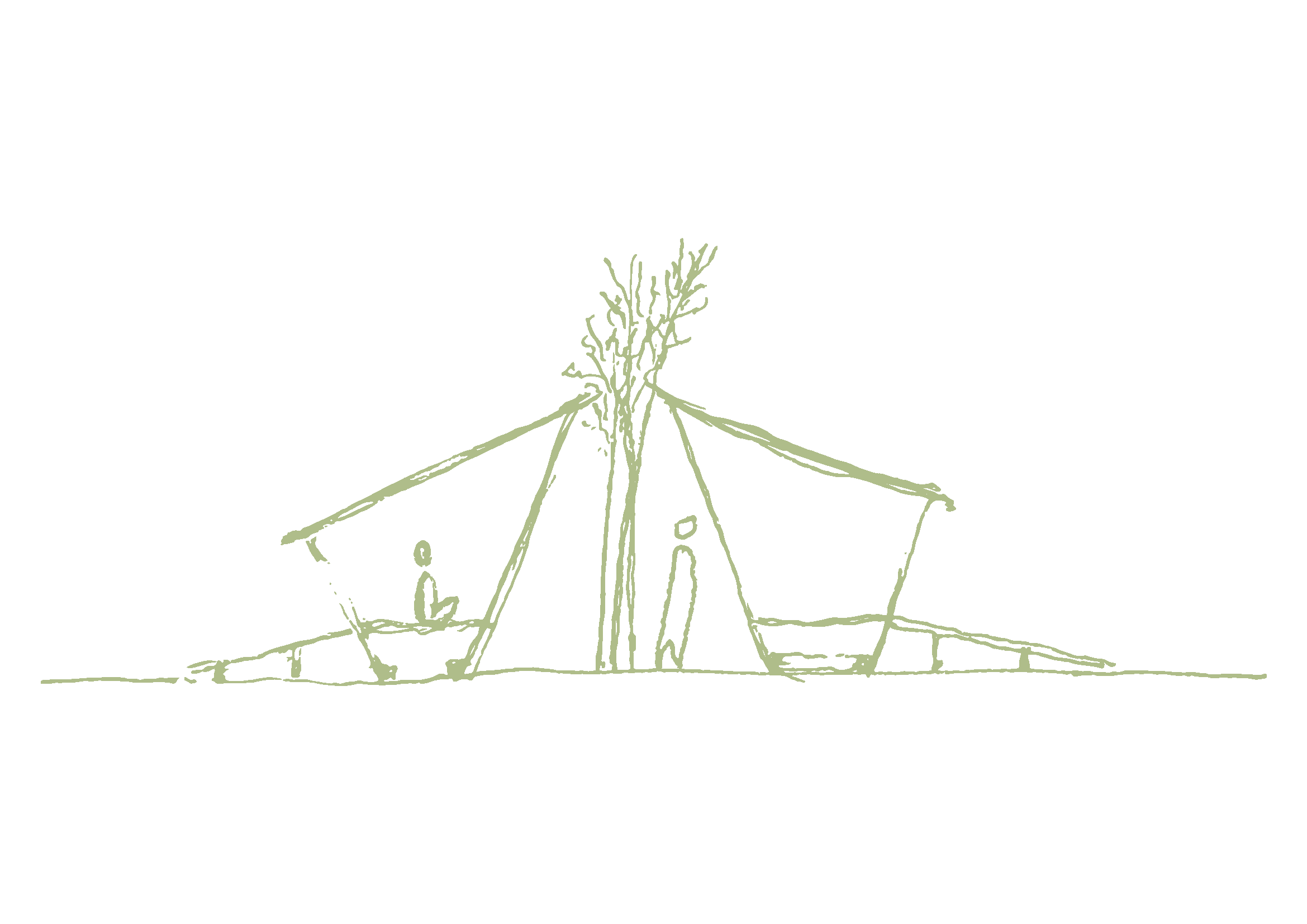 ombragé. Cette installation est ouverte à tous les horizons. Elle laisse voir en son cœur vivant une jeune plantation de bambou élancée vers un puits de lumière centrale.