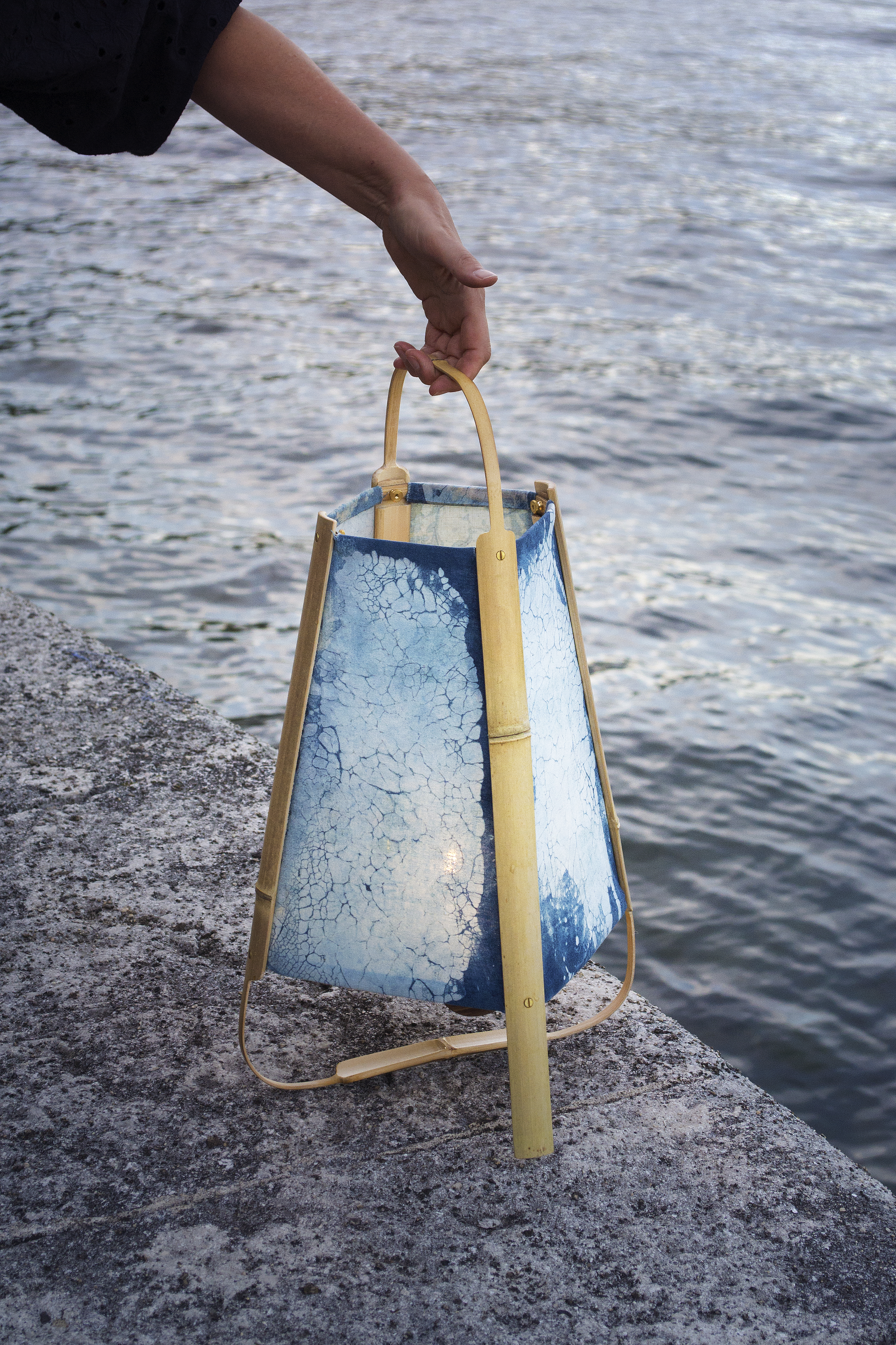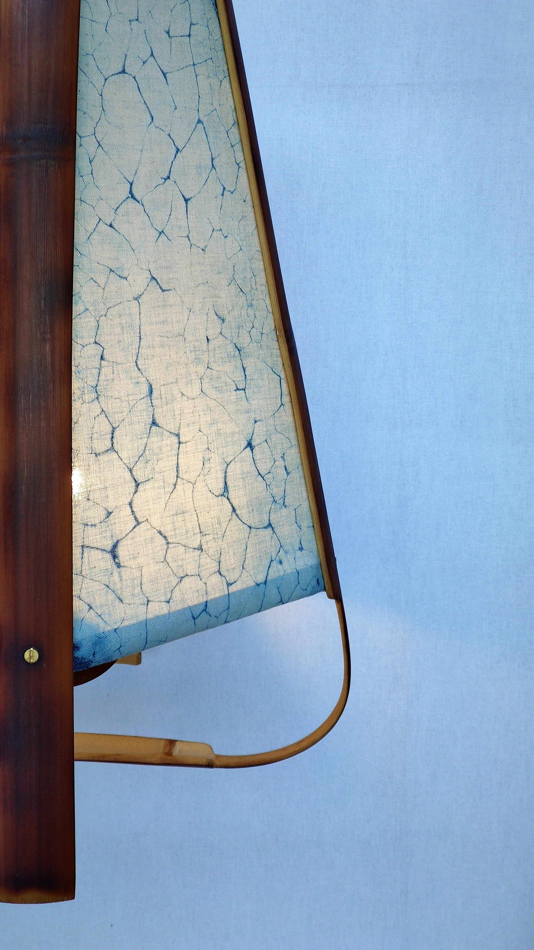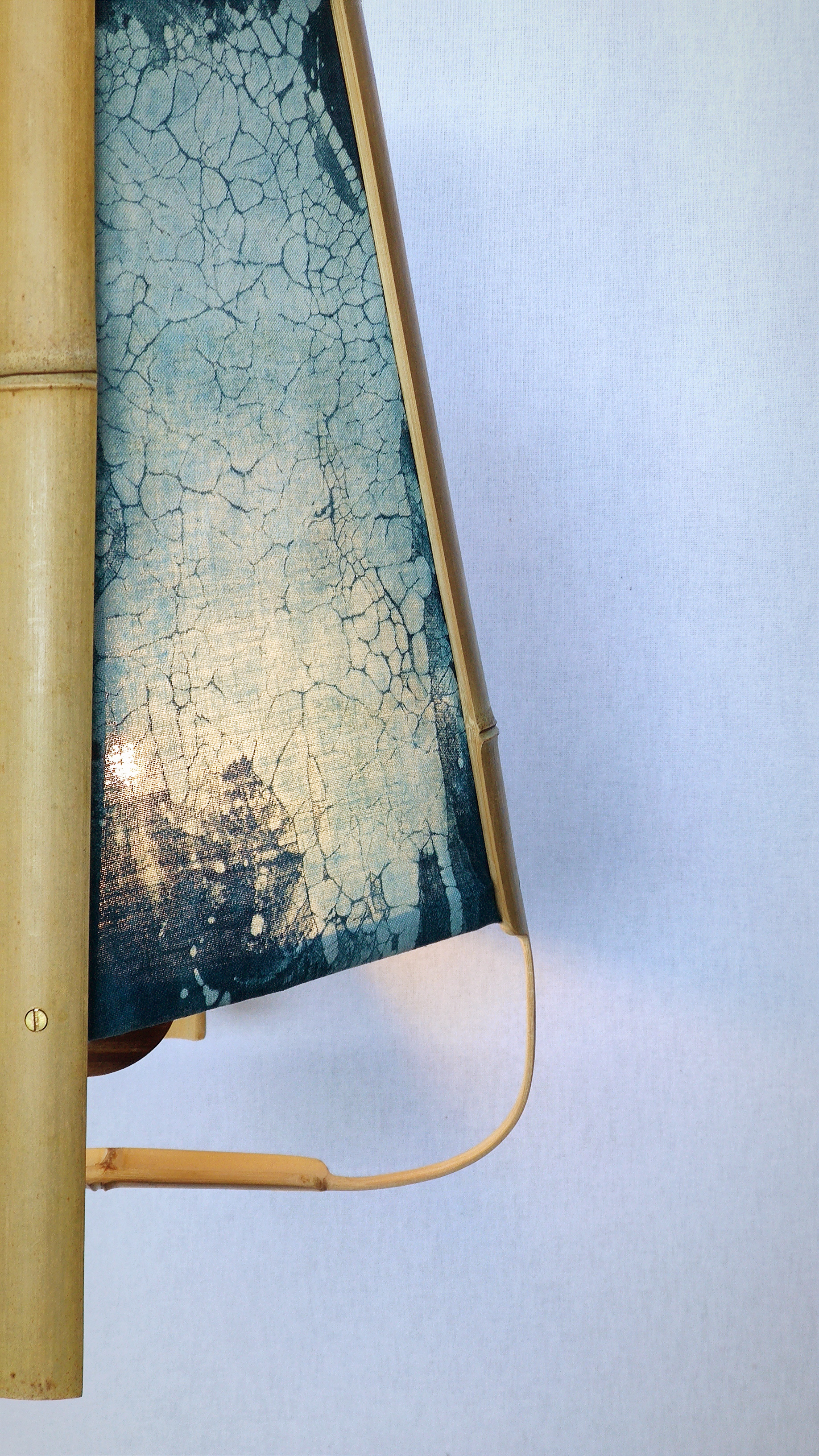 qui diffusent l’éclat des luminaires racontent aussi une histoire. Il s’agit de batiks teintés au cyanotype. Tout comme l’utilisation du bambou,