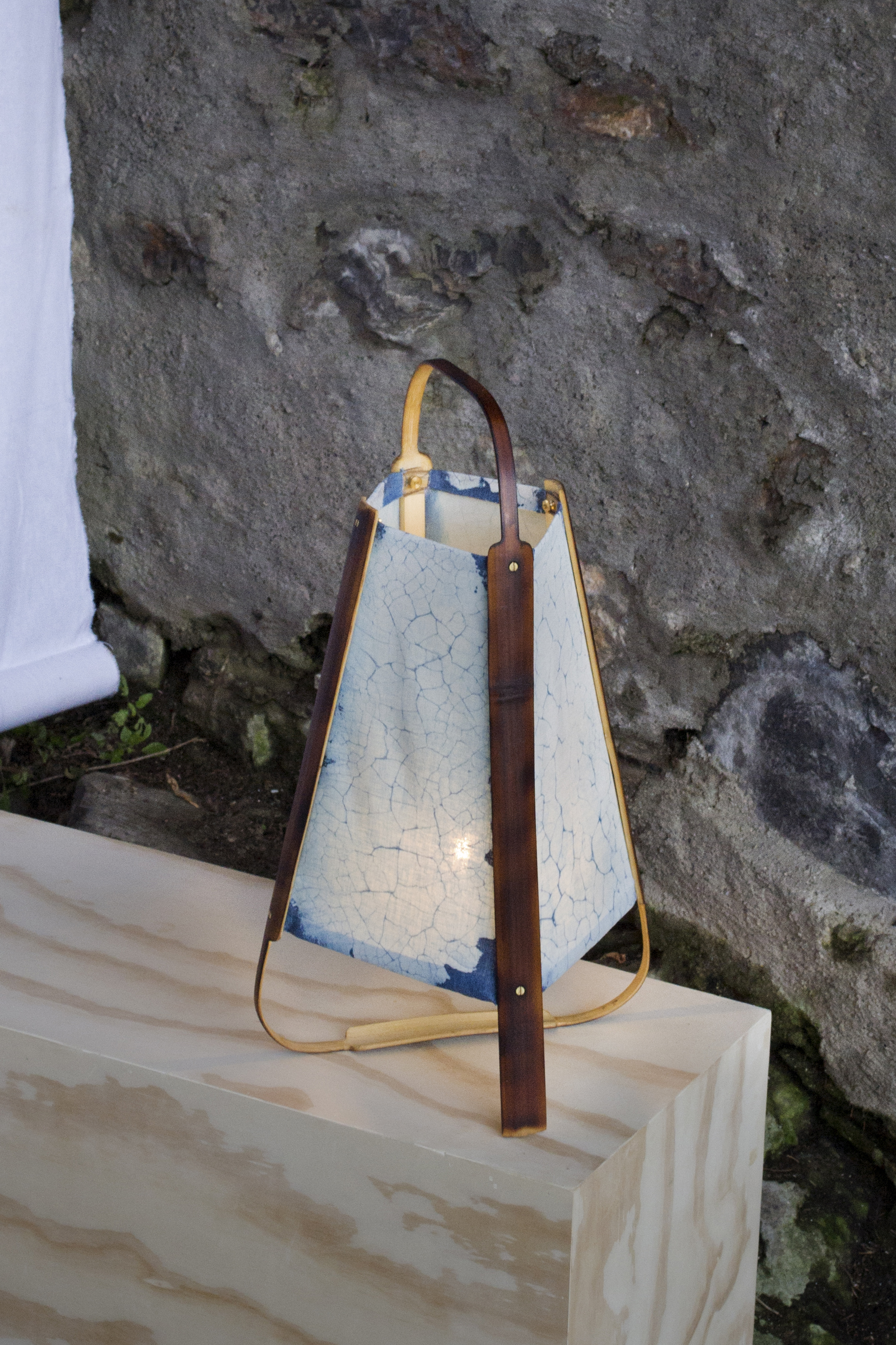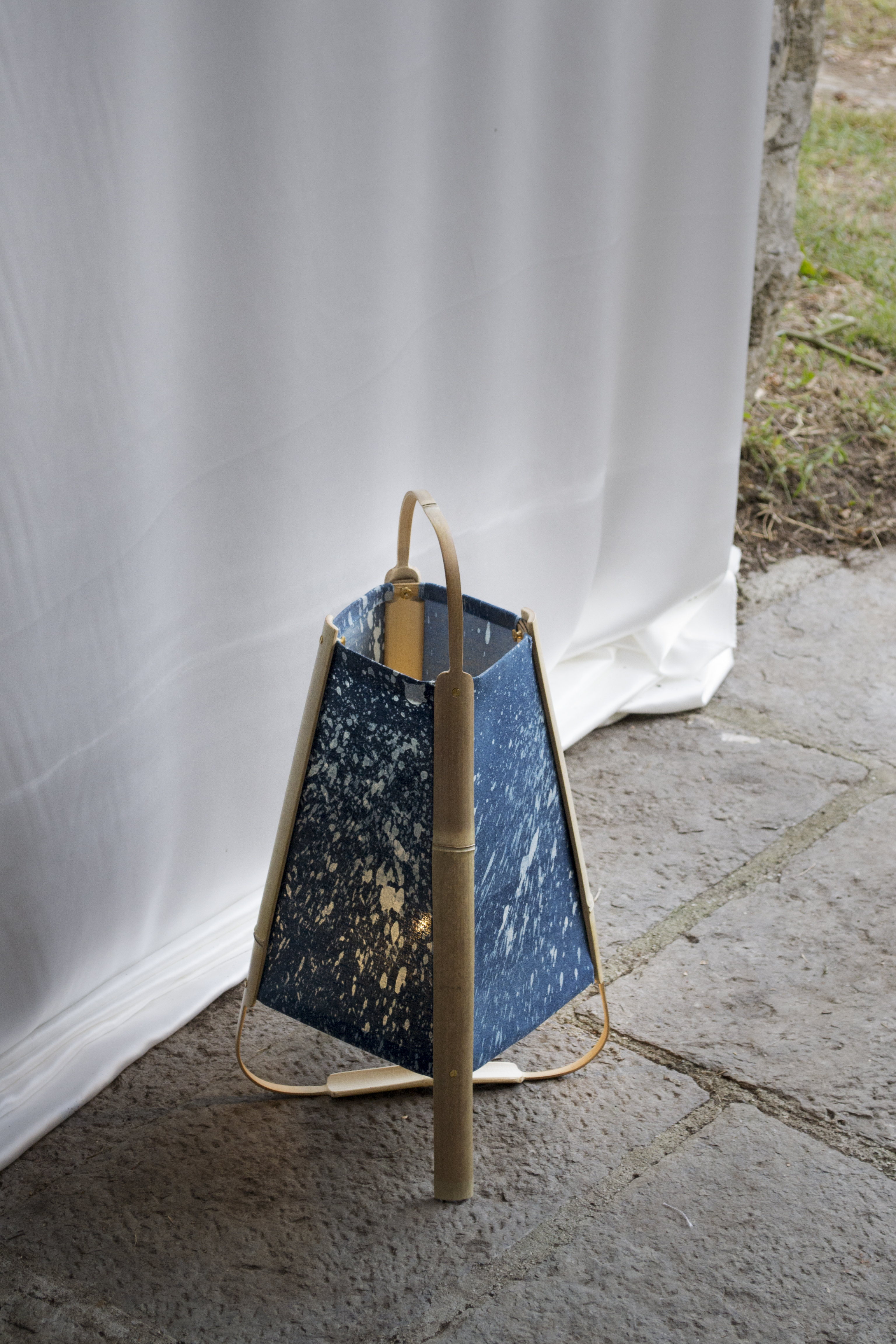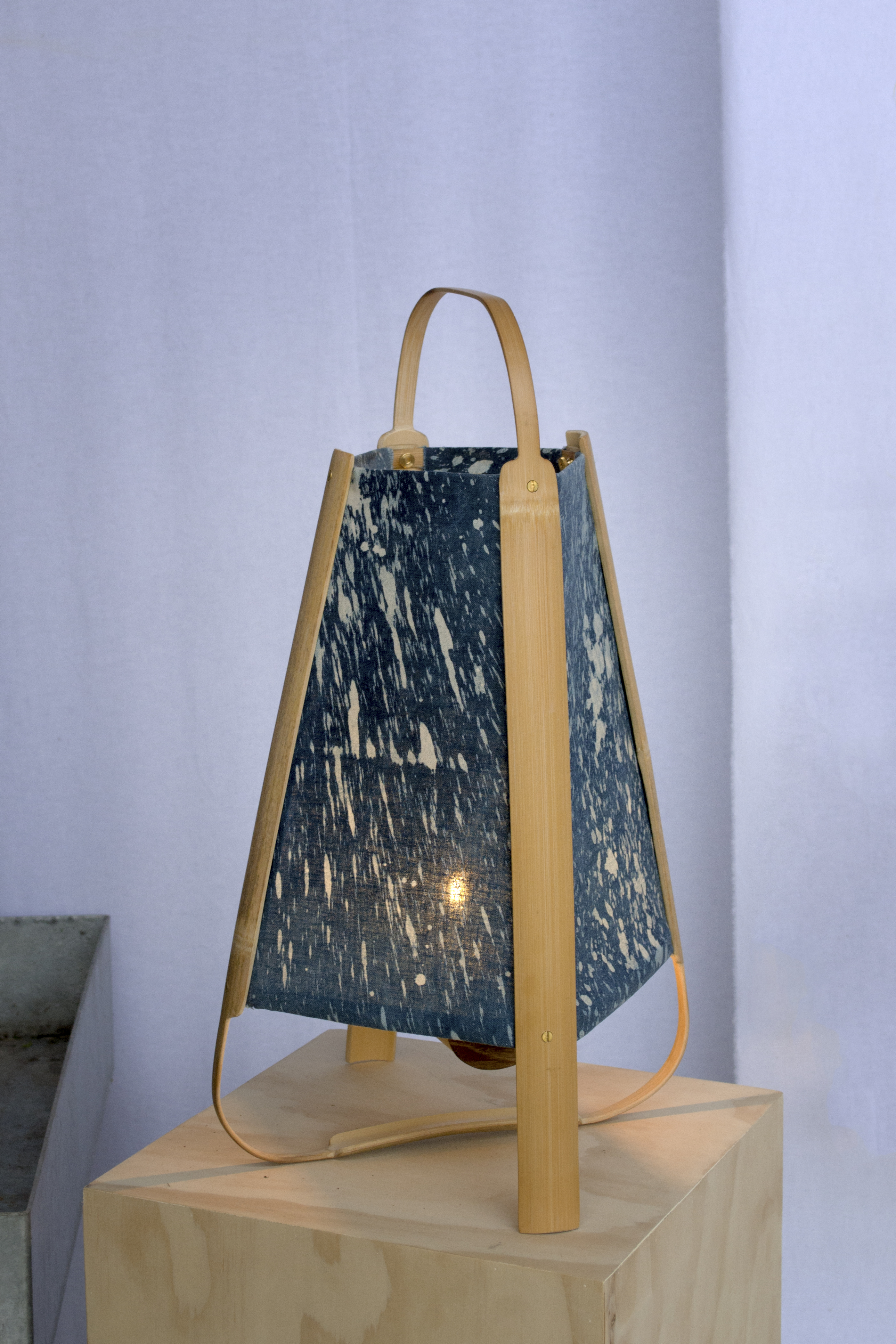 qui diffusent l’éclat des luminaires racontent aussi une histoire. Il s’agit de batiks teintés au cyanotype. Tout comme l’utilisation du bambou,
