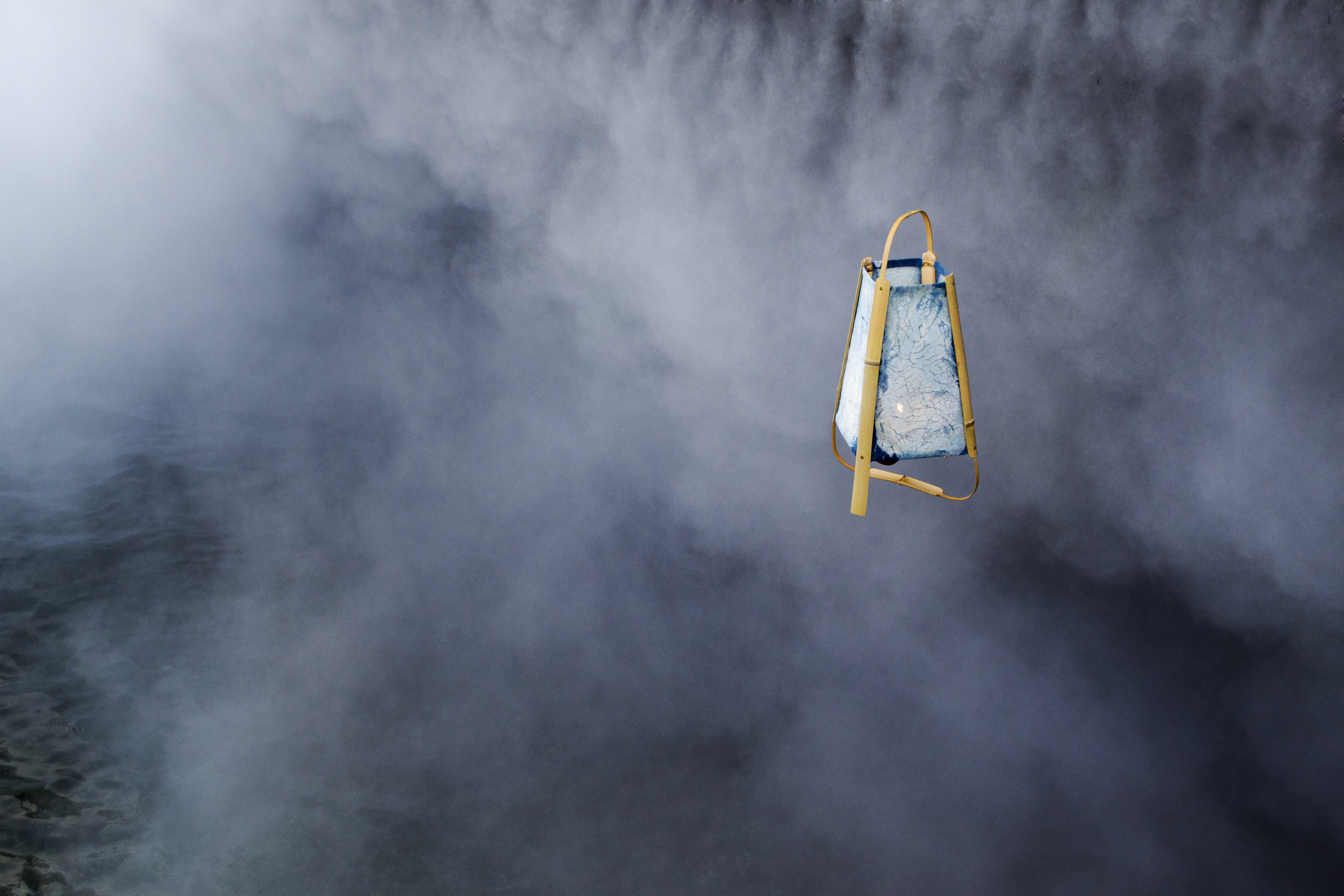 toile de coton teinté au cyanotype et système d’éclairage